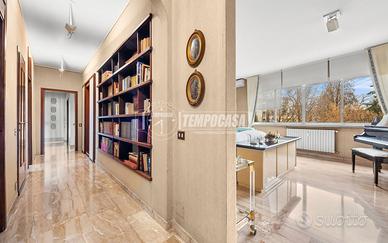 Gli spazi interni, armoniosi e confortevoli, caratterizzano un'abitazione fluida, signorile e sofisticata e si sviluppano attorno al salone triplo di grande fascino, affiancato da una cucina/tinello abitabile, sala da pranzo, due comodi bagni, oltre ripostiglio, e, nella zona notte, due camere da letto.