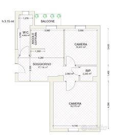 Ingresso nel soggiorno con cucinotto e balcone che espone sull'interno, due camere da letto, bagno, ripostiglio e cantina di pertinenza utile come spazio aggiuntivo di deposito.