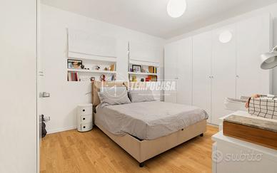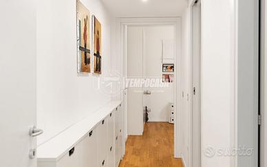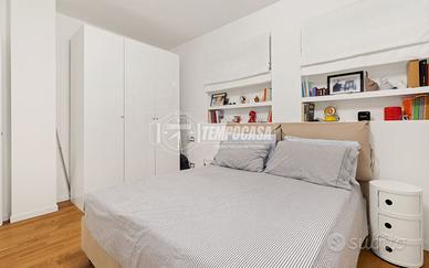 La distribuzione interna è funzionale e ben studiata: l'ingresso conduce a una accogliente zona living con cucina a vista, seguita da un disimpegno che separa in modo armonioso la zona notte, composta da una prima camera da letto attualmente adibita a studio (in origine cameretta), un ampio bagno finestrato completo di sanitari e box doccia in cristallo, e una camera matrimoniale confortevole e silenziosa.