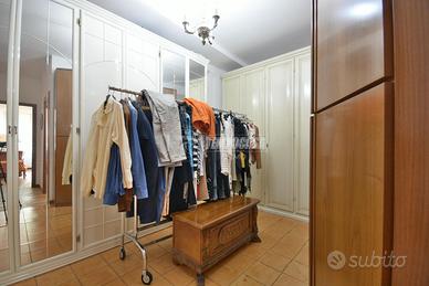 Dal salotto proseguiamo verso la cucina, con sfogo esterno di un balcone. Da questo momento si apre un particolare gioco di disimpegni e muri, costruito per sfruttare al meglio ogni spazio presente nella casa. Tre camere da letto e una cabina armadio,insieme ai due bagni, rappresentano gli utilizzi di tali spazi. In aggiunta la pertinenza dell'appartamento è quella di un comodo garage.