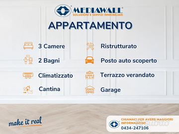 (Riferimento: BR-348-RV) Pordenone (BR-348-RV) ZONA STRATEGICA | ASCENSORE | CLIMATIZZATO CON DOPPIO SPLIT ZONA GIORNO E NOTTE | COMPLETAMENTE RISTRUTTURATO In zona Torre, in posizione strategica vicino a fermata dell'autobus, negozi, piste ciclabili, supermercati, in palazzina anni 70 servita da ascensore, proponiamo in vendita spazioso appartamento posto all'ultimo piano, climatizzato con doppio split zona giorno e zona notte, completamente ristrutturato nel 2020, così disposto: ingresso su ampio e luminoso salone con ripostiglio e con accesso al primo dei due terrazzi presenti, cucina separata di ottima metratura con accesso diretto al secondo terrazzo verandato ( ottimo come zona lavanderia) di cui l'immobile è dotato, disimpegno, tre ampie camere di cui due matrimoniali ed una doppia, due bagni entrambi con box doccia e finestrati di cui uno padronale. Al piano interrato, cantina, garage e posto auto scoperto. NON PERDERE L'OCCASIONE, PRENOTA SUBITO LA TUA VISITA!
