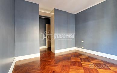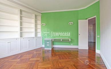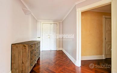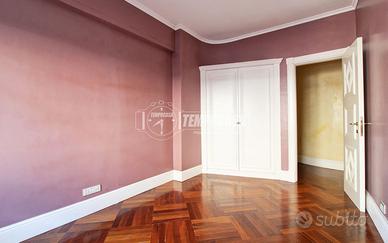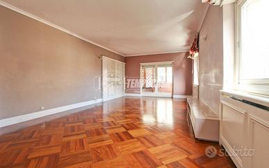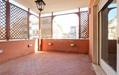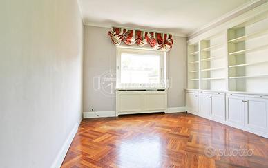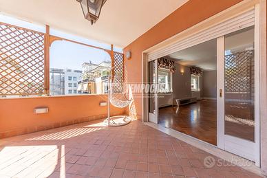 L'appartamento si sviluppa su una superficie di circa 200 mq, con una disposizione interna armoniosa e funzionale, che unisce rappresentanza e vivibilità quotidiana. L'ingresso principale introduce in un ampio disimpegno che si apre su un salone doppio, luminosissimo, grazie a due grandi finestre e una porta finestra che conduce a una terrazza abitabile, spaziosa e ben esposta, perfetta per godere di momenti di relax all'aperto o per accogliere ospiti in un ambiente riservato e gradevole. Adiacente al salone, e ben integrato nel cuore della zona giorno, si trova un ampio studio, ideale come spazio di lavoro o come ulteriore zona relax. Sempre dall'ingresso si accede alla cucina abitabile, comoda e ben organizzata, collegata a una zona di servizio completa di una piccola camera e un bagno dedicato.