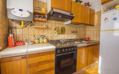 ingresso su soggiorno, cucina separata, disimpegno, due camere da letto e doppi servizi (uno finestrato con vasca e uno cieco con doccia).