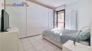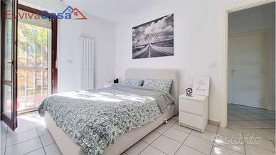 Un disimpegno elegante separa la zona living dalla zona notte, dove trovi due camere ampie, entrambe con accesso diretto alla seconda corte privata, ideale per chi desidera intimità e tranquillità.