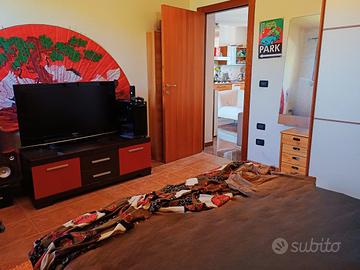 L' appartamento di buone dimensioni è al piano terra di un condominio di sole 4 unità. Ha ingresso indipendente da cui si accede direttamente alla zona giorno, caratterizzata da un'angolo cottura con bancone centrale, lo spazio per due piccoli divani, il mobile tv e una stufa a legna e pellet. La zona giorno comunica direttamente con una camera matrimoniale di buone dimensioni in cui ci sta comodamente un guardaroba ed una scrivania o una cassettiera. Sempre dalla zona giorno si accede ad un antibagno finestrato con funzioni di ripostiglio e lavanderia. Da esso si procede ad un bagno di dimensioni generose, luminoso e finestrato.