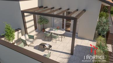 La zona living si distingue per la straordinaria luminosità grazie all'ampia vetrata che crea un dialogo armonioso tra interno ed esterno, aprendo la vista sul verde del giardino dove è prevista una comoda pompeiana, perfetta per pranzi e cene all'aperto.