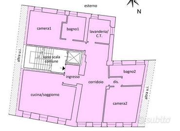 Lunità si trova al primo piano di un edificio residenziale e risulta composta ingresso, cucina-soggiorno, ampio corridoio centrale (utilizzato come salotto), lavanderia con centrale termica, due camere, disimpegno e due bagni.