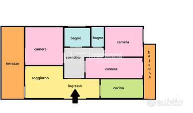 Comodo Ingresso, da Pianerottolo, su Soggiorno dotato di Porta-Finestra per accedere al Terrazzo da cui si accede anche dalla Prima Camera da Letto, Cucina abitabile che permette di andare sul Balcone da cui si può accedere anche dalle altre due Camere Da Letto, Bagno dotato di Finestra e box doccia e infine un Secondo Bagno.