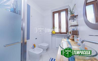 Un bagno rifinito in ceramica con moderno doccia box, pensato per offrire massima comodità.