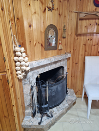 cucina,divano letto matrimoniale in zona living, divano letto matrimoniale in camera da letto, tavola e sedie, credenza, mobili vari a scomparsa, frigorifero, forno, lavatrice, piastre elettriche, piano cottura a gas,lavello,scaldino elettrico .