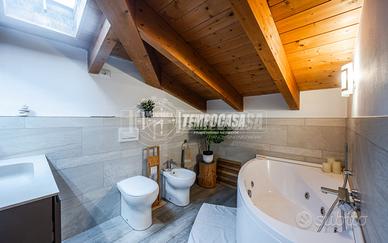 Nel primo bagno troviamo sanitari sospesi, box doccia e termoarredi e rivestimenti in gress mentre nel secondo bagno vasca idromassaggio e sanitari poggiati.