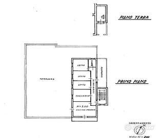 Al piano primo accedibile tramite scala adiacente ma separata dal negozio, troviamo un appartamento di quattro vani composto da cucina, salone, tre camere ed un bagno con una balconata a servizio della cucina ed un generoso terrazzo che serve tutto l'immobile di circa 325 mq oltre ad un terrazzino che da luce al corridoio.