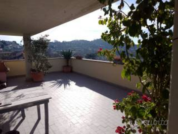 Attico bilivelli in condominio , di 125 MQ . Oltre , terrazzo , ampio balcone e balconcino , per totali MT 185 circa , con affaccio su giardino condominiale di 10000mq. ben curato mensilmente con piano dei tagli , Panoramico , doppia esposizione, luminosissimo , poiché esposto verso sud , cosi distribuito :