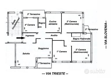 In zona semicentrale (Via Trieste 75): e ben collegata, proponiamo in vendita ampio e luminoso appartamento, libero su tre lati, situato al 2° piano di un piccolo condominio di sole 4 unità, senza ascensore, con giardino condominiale. L'immobile è così composto: o ingresso o ampio salone o cucina abitabile o 4 camere da letto o 2 bagni recentemente ristrutturati Completano la proprietà: 3 balconi e garage di 53 mq, collegato direttamente al condominio Dotazioni e ristrutturazioni: Cappotto termico (EPS 10 cm) e facciata rifatta; Infissi nuovi in PVC con vetrocamera; Portoncino blindato classe 3; Impianto ACS con pompa di calore (bollitore 300 L); Climatizzazione con pompe di calore (dual + mono split); Impianto fotovoltaico 6,15 kW; Allarme e cassaforte Classe energetica A4 Massimo risparmio energetico e possibilità di accesso a mutui green con condizioni vantaggiose. Ideale per Famiglie che cercano spazi ampi, comfort moderno e bassi consumi.