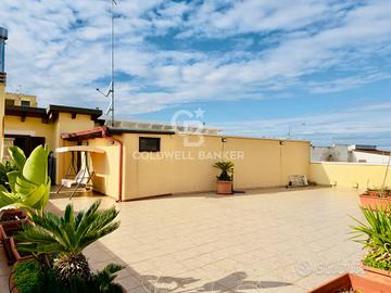 Una splendida scala in marmo di Trani conduce al piano superiore, dove si sviluppa una raffinata mansarda di circa 60 mq: qui trovano spazio una cucina open space in muratura, un bagno e una terrazza privata, perfetta per momenti di relax o convivialità allaperto.