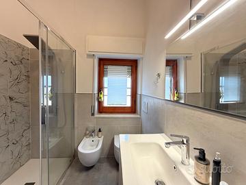La zona notte comprende tre camere da letto di generose dimensioni, tutte con grandi finestre che garantiscono ottima luminosità, e due bagni finemente rifiniti e completi di ogni comfort.