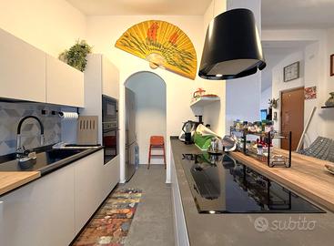 L'ingresso si apre su un ampio e luminoso soggiorno, una cucina moderna con isola, piano a induzione, cappa di design e pratica dispensa.