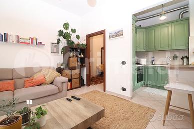 Descrizione: In palazzina ben ristrutturata con facciate e tetto di recente riattazione, proponiamo in palazzina di tre piani ottimo bilocale di generosa metratura, organizzato con funzionale disimpegno da cui si accede da un lato al soggiorno con angolo cottura e balcone, e dall'altro lato si accede alla camera matrimoniale con secondo balcone e bagno finestrato.