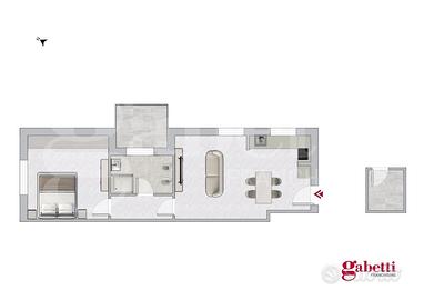 L'appartamento è composto da ampio e luminoso soggiorno con angolo cottura, camera da letto matrimoniale, bagno con accesso diretto al balcone e disimpegno.