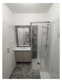 Bagno ristrutturato, coppia sanitari nuovi, piatto doccia e termoarredo cromato.