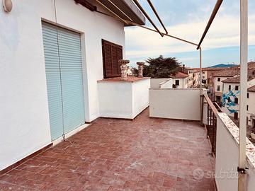 Terrazza intorno al 90% della proprietà , con due aree grandi per soggiornare entrambe con vista sul paese vecchio e campagna circostante , ottimo condominio ben gestito , condizioni buonissime , finiture di pregio possibilità di vendita arredato .