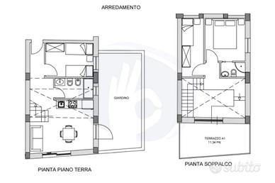 Piano terra: ingresso, luminoso soggiorno con cucina a vista, camera da letto doppia, bagno e accesso diretto al giardinetto privato di circa 25 mq, con possibilità di realizzare un elegante pergolato.