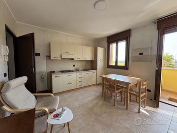 L'ingresso si apre su una luminosa zona giorno con angolo cottura, dove lo spazio è ben distribuito e accogliente. La camera da letto e il bagno con doccia completano la parte abitativa, regalando un ambiente intimo e funzionale. Essendo un appartamento d'angolo, gode di un ampio terrazzo che abbraccia sia la zona giorno che la camera, perfetto per momenti di relax all'aperto. Al piano seminterrato è presente un garage di proprietà, comodo e facilmente accessibile.