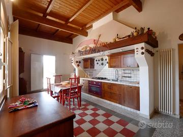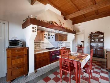 La comoda sala da pranzo e l'ampia zona conversazione, in cui è presente uno splendido camino, hanno accesso diretto alla cucina abitabile, quest'ultima presenta un bagno con antibagno ed una comoda zona lavanderia.