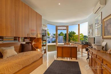 Il vero valore aggiunto di questa casa è il terrazzo coperto, uno spazio da vivere in ogni stagione, che si apre su una vista incantevole: da qui il mare e lorizzonte si incontrano in un abbraccio senza fine, regalando emozioni che cambiano con la luce del giorno.