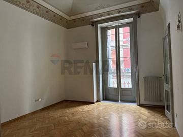 Entrando troviamo la zona soggiorno-pranzo con cucina, un ambiente luminoso grazie alle due finestre che affacciano sul balcone interno. È uno spazio funzionale, facile da vivere, adatto sia alla quotidianità sia ai momenti di convivialità. Il bagno principale è stato appena ristrutturato, quindi non richiede interventi: è moderno, curato e pronto alluso. Il vero elemento distintivo della casa è il salone. Parquet a spina di pesce, affresco al soffitto e un grande finestrone che affaccia sul balcone di Via De Giosa.