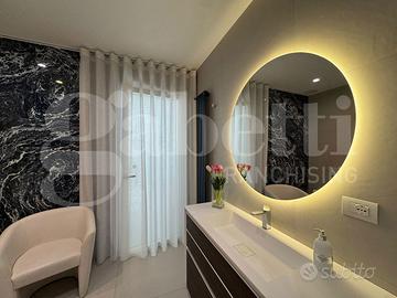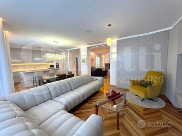 L'appartamento è dotato di impianti tecnologici all'avanguardia, tra cui un sistema di diffusione audio con casse in tutti gli ambienti per un'esperienza sonora completa, un sistema di allarme antintrusione Tecnoalarm e videosorveglianza robotizzata che garantiscono la massima sicurezza. Gli infissi della ditta DE CARLO Ekasa Group, legno interno e alluminio esterno, sono completi di sistema di apertura vasistas nonché di tapparelle motorizzate e centralizzate con zanzariere annesse e cassettoni filo muro che permettono di regolare facilmente la luce e la privacy, mentre l'illuminazione dei varchitenda aggiunge un tocco di eleganza.