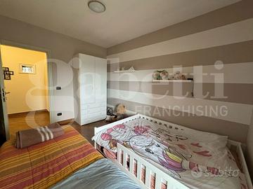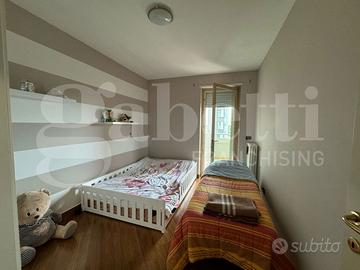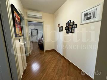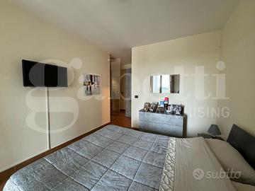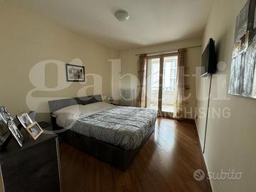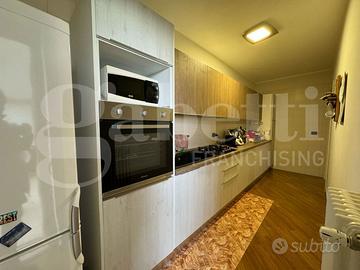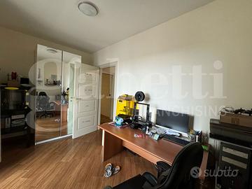 L'ingresso accoglie subito in un ambiente caldo e ben organizzato, con un luminoso soggiorno che si integra perfettamente con la zona pranzo e un cucinino spazioso e funzionale. L'appartamento dispone inoltre di uno studio, ideale per chi lavora da casa, un ampio disimpegno che offre lo spazio perfetto per un pratico armadio a muro, due camere da letto confortevoli e due bagni, di cui uno in camera.