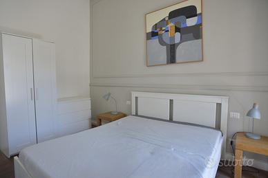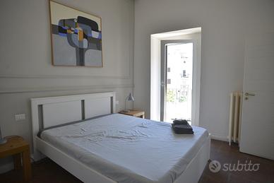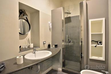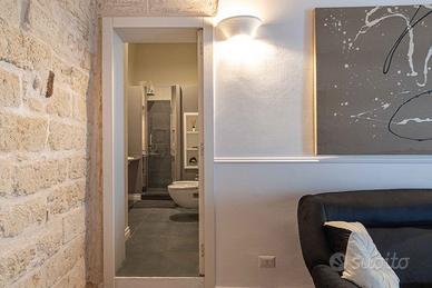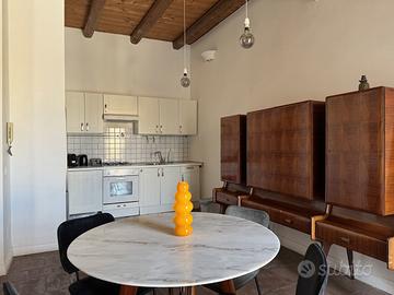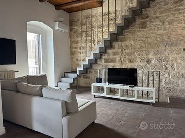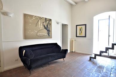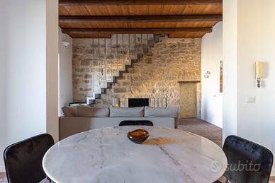 Con una bella scala, sapientemente inserita nel contesto, giungiamo in un open space. In questo grande ambiente, estremamente arioso e luminoso, lo spazio è solo idealmente diviso: il soggiorno ha un affaccio suggestivo sulla piazza; alla stessa maniera la zona pranzo con cucina a vista in stile minimalista, completa degli elettrodomestici, è posizionata davanti al secondo affaccio sulla piazza.