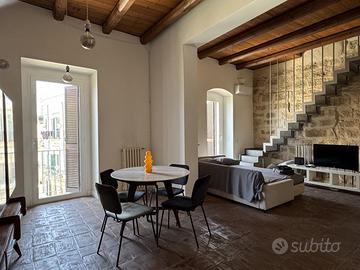 Con una bella scala, sapientemente inserita nel contesto, giungiamo in un open space. In questo grande ambiente, estremamente arioso e luminoso, lo spazio è solo idealmente diviso: il soggiorno ha un affaccio suggestivo sulla piazza; alla stessa maniera la zona pranzo con cucina a vista ha la piacevole vista sulla piazza.