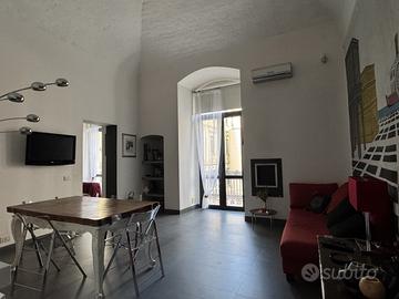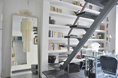 L'appartamento è molto luminoso ed entrando manifesta al primo sguardo la sua personalità. L'ingresso ci introduce nello studio caratterizzato dalle volte alte mt. 3,85 ca., da una bella libreria a tutt'altezza e dall'affaccio con un balcone con affaccio esterno. L'ambiente attiguo, anch'esso con le volte alte mt. 3,85, è molto ampio ed è diviso nella zona salotto contraddistinta da una grande e bella tela fa da ricercato sfondo; nel medesimo ambiente la cucina a vista completata dalla zona pranzo.