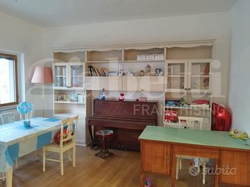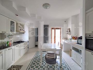 L'ingresso conduce a un ampio salone doppio, molto luminoso, impreziosito - come la cucina - da tappeti ornamentali in cementine MIPA, realizzati con la tradizionale tecnica in graniglia di marmo. La cucina, separata ma comunicante con la zona giorno, è completamente attrezzata, con finiture coerenti e funzionali.
