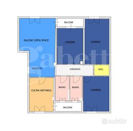 L'appartamento è composto da: ingresso, salone open space, tre camere, due bagni, cucina abitabile, ripostiglio, due balconi. Si presenta in ottime condizioni di manutenzione con infissi a taglio termico da 65 mm, pavimentazione in gres porcellanato effetto cemento, impianto elettrico a norma ma sprovvisto di certificazione, 2 climatizzatori Samsung, tenda impermeabile, porte sostituite e laccate bianche, caldaia baxi 2019.