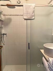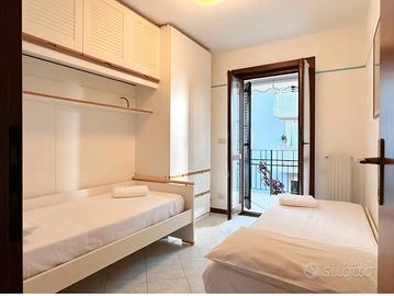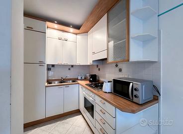 2 camere, una matrimoniale e l'altra con doppio letto singolo. 2 bagni entrambi con doccia. Ampia terrazza. Riscaldamento autonomo con caldaia a condensazione. Pompa di calore. Parcheggio privato all'interno della corte condominiale. Secondo piano con ascensore. Spese condominiali ?100 al mese da pagare in aggiunta al canone. Arredata e con corredo ( piatti bicchieri ecc) Possibilità di pulizie e cambio lenzuola settimanale con tariffa da concordare. Possibilità di conteggiare le utenze acqua luce e gas a consumo.