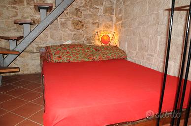 L'appartamento è nel Borgo Antico di Giovinazzo. E' ammobiliato e si sviluppa su tre livelli. Al piano terra c'è un ingresso soggiorno, al secondo piano ci sono la cucina con un balconcino e il bagno completo di doccia e lavatrice, al terzo piano c'è la camera da letto matrimoniale e dopo un'altra rampa di scale c'è un disimpegno che affaccia su un terrazzino. L'affitto mensile è di € 470. Non ci sono spese condominiali perchè trattasi di un appartamento indipendente. E' adatto a single o coppie. Non è adatto a persone anziane e a bambini.