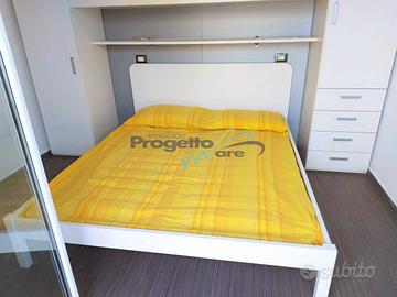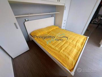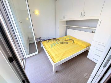 La camera da letto, luminosa e silenziosa, si apre su un balcone con piccolo scorcio di vista mare, dove potrai concederti un momento di relax ogni giorno.