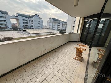 Appartamento situato al secondo piano, servito da ascensore, composto da zona giorno open space molto luminosa con ampia vetrata con accesso al terrazzo abitabile che si affaccia nel giardino pensile interno ad uso condominiale, disimpegno con armadio a muro, bagno finestrato completo di box doccia, camera matrimoniale anch'essa con portafinestra con accesso diretto al terrazzo.