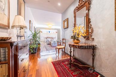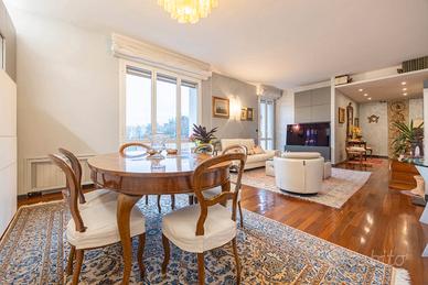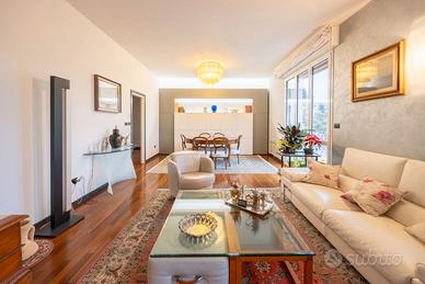 Proponiamo esclusivo e prestigioso appartamento di 160 mq situato al piano alto di un condominio signorile oggetto di una recente e completa ristrutturazione con efficientamento energetico, che include l'installazione di un cappotto esterno. Sono stati inoltre rifatti il tetto e i balconi. L'immobile, molto panoramico, gode di una grande luminosità per la sua tripla esposizione e presenta una distribuzione degli spazi estremamente funzionale ed é composto da: ampio ingresso che conduce direttamente all'area giorno, salone doppio di 35 mq - luminoso e panoramico dotato di ampia vetrate - cucina abitabile, quattro camere da letto/studio attualmente distribuiti come - due camere da letto, uno studio, una camera guardaroba o singola - due bagni, ripostiglio e due balconi. La zona offre la comodità di avere l'asilo nido e le scuole elementari nelle immediate vicinanze rendendola una soluzione ideale anche per una famiglia numerosa. Completano la proprietà una cantina ed un posto auto di proprietà coperto. APE: D - EURO 740.000 + p.a. coperto EURO 50.000