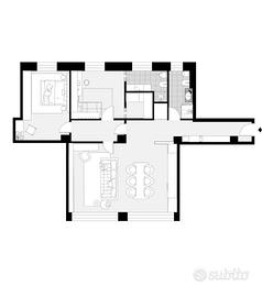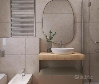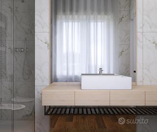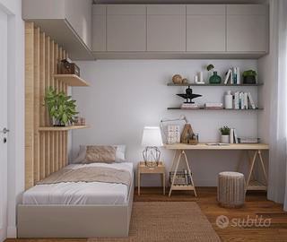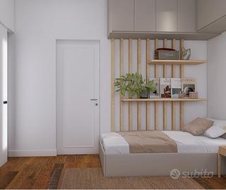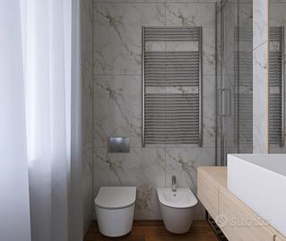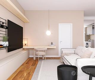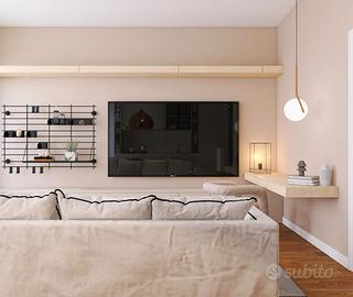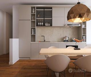 L'immobile si compone di un ingresso arredabile, ampio open space con zona soggiorno e angolo cottura, due camere da letto (di cui una dotata di cabina armadio e bagno privato), secondo bagno finestrato e vano lavanderia separato.