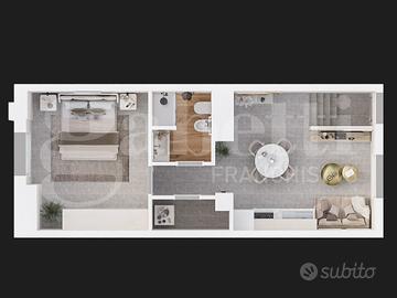 Gli appartamenti, saranno dotati di ingresso indipendente da corte condominiale e grazie ad una piccola scala interna, si svilupperanno al piano rialzato, garantendone una maggiore privacy e tranquillità. L'appartamento internamente è composto da ingresso su zona living con cucina a vista, bagno non finestrato, ripostiglio, ed una camera matrimoniale.