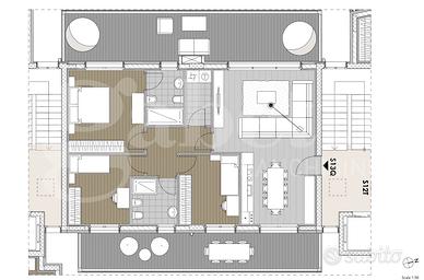 Questa soluzione vanta spazi ben distribuiti e finiture di alta qualità; una zona giorno che affaccia su due logge (una sulla zona cucina e una sulla zona living): la prima di circa 23 metri quadrati e la seconda di 32, una camera matrimoniale, due camere doppie, un ripostiglio/lavanderia e due bagni.