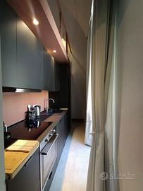 L'abitazione molto luminosa con con 2 balconi che affacciano su corso Roma presenta volte a botte affrescate e si compone di ingresso con armadio a muro dotato di illuminazione interna, una zona giorno composta da una cucina dal design moderno Lube, ampio soggiorno con comodo divano letto e un bagno, dallo stile contemporaneo con ampia doccia