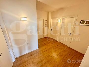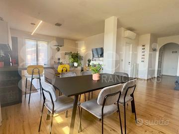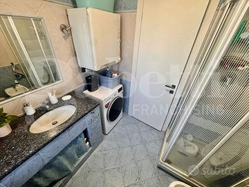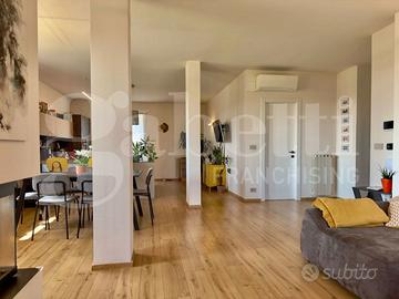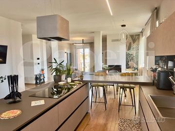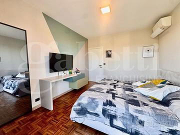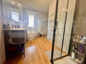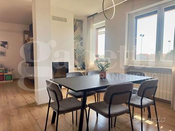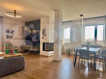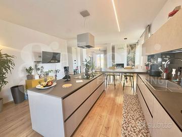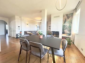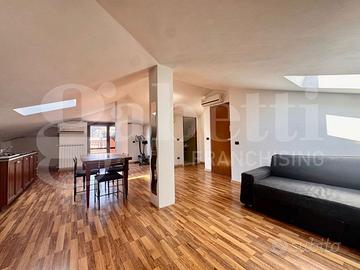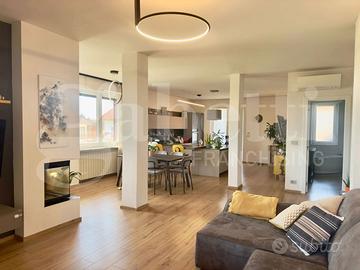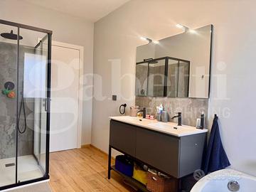 IN TRATTATIVA. Zona residenziale, proponiamo splendido appartamento in villa bifamiliare sito al piano primo di ingresso, soggiorno con camino, cucina abitabile a vista, disimpegno, tre camere (di cui una con cabina armadi), doppi servizi e 4 balconi. Mansarda open space con servizio e terrazzo ed ingresso indipendente dal vano scala comune all'unità abitativa sottostante. Box doppio in larghezza con basculanti automatizzati. Giardino di proprietà sito al piano terreno di c .a 340 mq. L'appartamento risulta totalmente ristrutturato. Pannelli fotovoltaici. Caldaia ibrida a condensazione. Pompa di calore. Condizionatori. Antifurto P/V Zanzariere