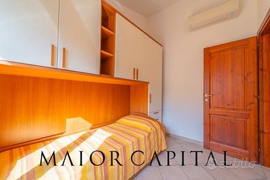 Labitazione si apre sul soggiorno con cucina a vista, ambiente luminoso e ben distribuito, dal quale si gode una suggestiva vista panoramica sul mare. A seguire, unampia veranda coperta con la stessa esposizione valorizza ulteriormente la zona giorno. Un disimpegno separa la zona giorno dalla zona notte, composta da una camera matrimoniale, una camera singola e un bagno finestrato con doccia. Completa la proprietà una corte.