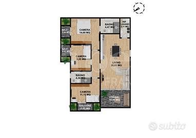 accede alla loggia di 10 mq, ripostiglio/lavanderia, disimpegno notte, bagno, camera matrimoniale con