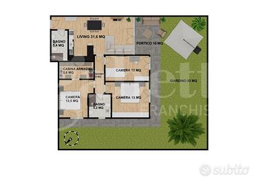 Esempio unità 1 - Piano Terra - SLV 129 mq - Ingresso su ampio living con parete vetrata da cui si accede al portico di 11 mq ed al giardino privato di 115 mq accessibile da ogni stanza, bagno/lavanderia, disimpegno notte, bagno, camera matrimoniale con cabina armadio, seconda camera matrimoniale e terza camera doppia. La stessa tipologia è disponibile anche al piano primo, secondo, terzo e quarto. Euro 414.000 oltre IVA. Volendo disponibilità di garage e posti auto. Consegna 2027.